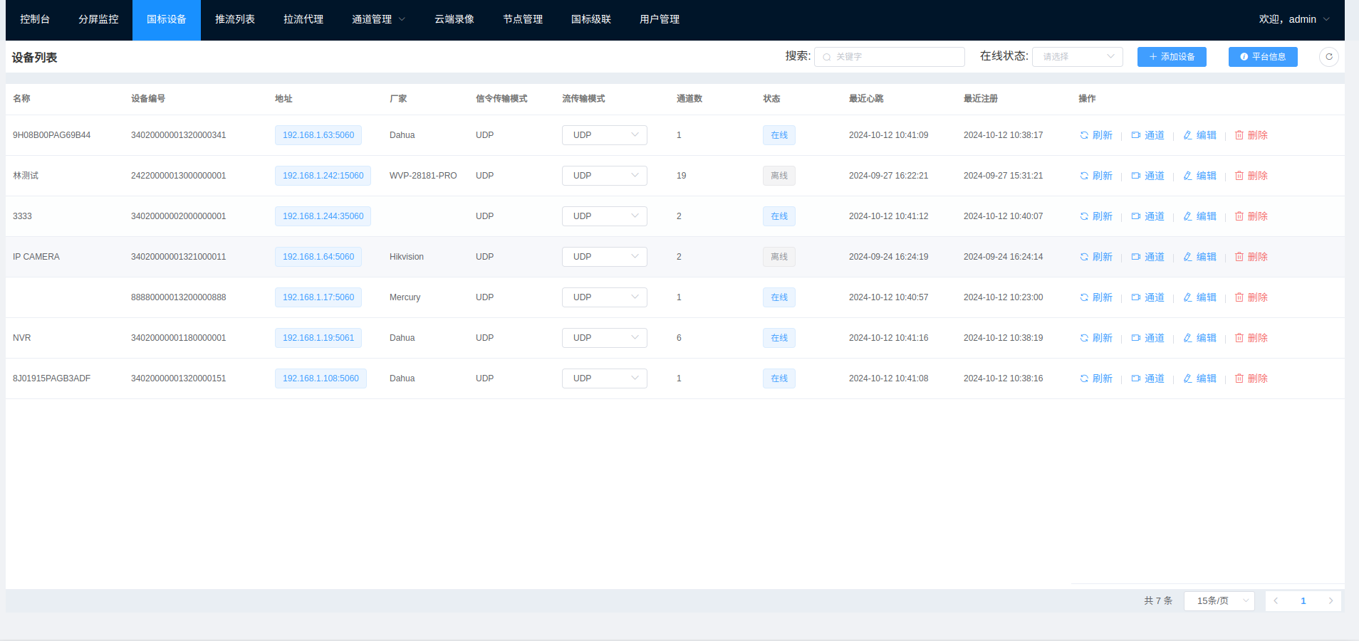 WEB VIDEO PLATFORM是一个基于GB28181-2016标准实现的开箱即用的网络视频平台,负责实现核心信令与设备管理后台部分,支持NAT穿透,支持海康、大华、宇视等品牌的IPC、NVR接入。支持国标级联,支持将不带国标功能的摄像机/直播流/直播推流转发到其他国标平台。