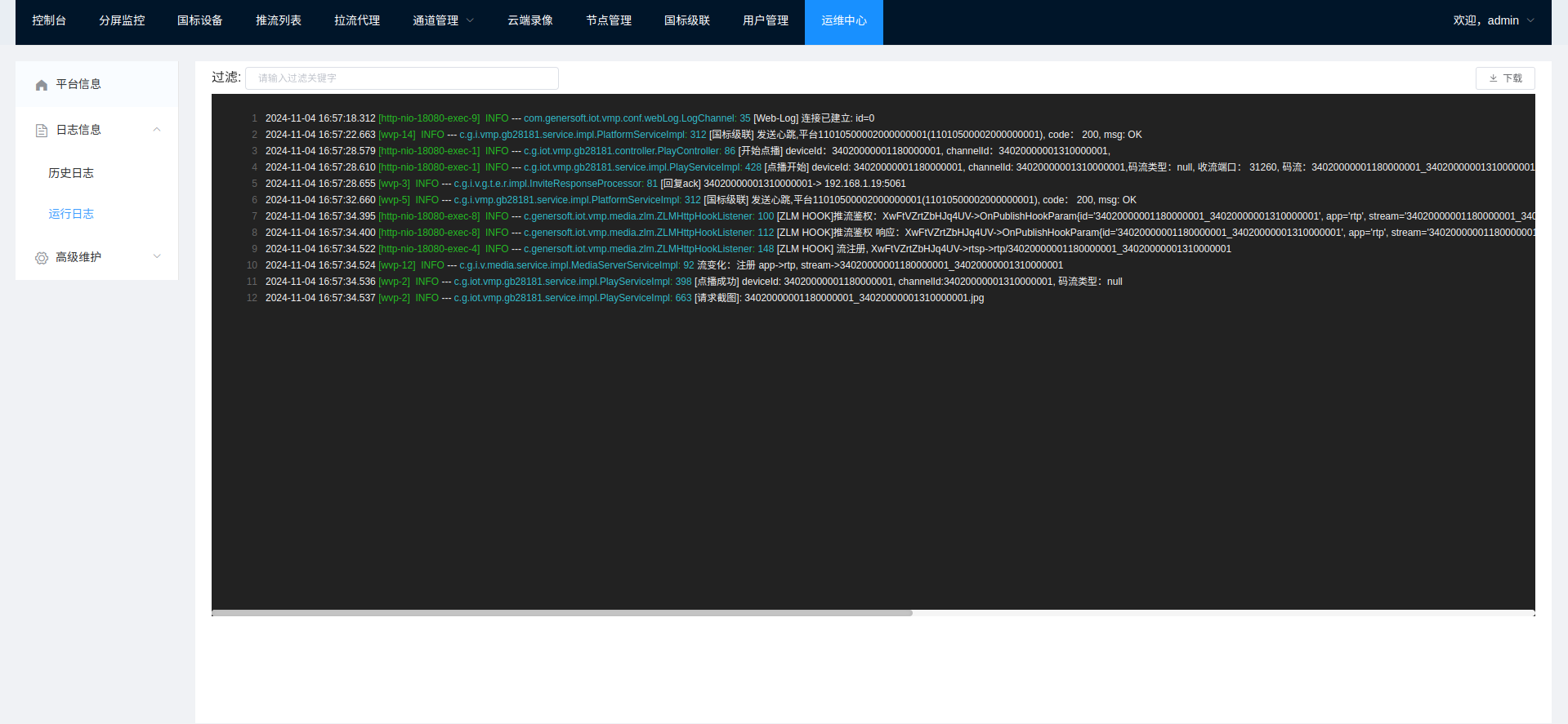WEB VIDEO PLATFORM是一个基于GB28181-2016标准实现的开箱即用的网络视频平台,负责实现核心信令与设备管理后台部分,支持NAT穿透,支持海康、大华、宇视等品牌的IPC、NVR接入。支持国标级联,支持将不带国标功能的摄像机/直播流/直播推流转发到其他国标平台。